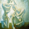 The painting "Nostalgia" reflects a deep emotional connection with the past through abstract images. The two figures located on it seem to be united by an unspeakable longing and memories. Their poses, filled with softness and vulnerability, seem to convey a moment of reflection or shared sadness.