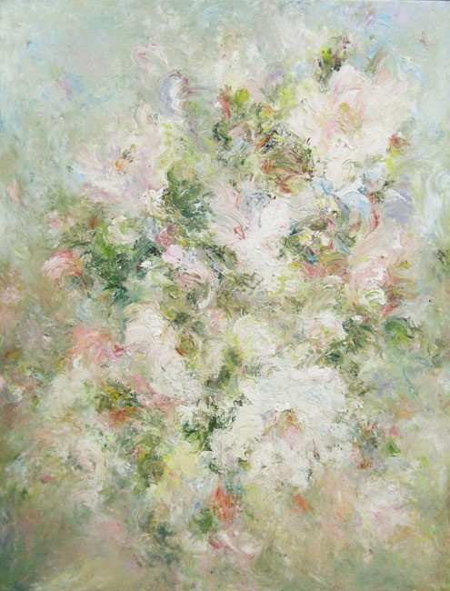 Abstract brushstrokes do not have clear contours, which makes the composition almost ephemeral. It seems as if clouds of flowers are swirling in a dance, reflecting the movement of the wind and the murmur of a bright day. Spots of light seem to illuminate the painting from the inside, symbolizing the awakening and dawn of nature.