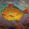 The painting “Big Fish” is executed in a bold and rough manner, conveying a sense of vitality and power of nature. The central image is a weighty fish in rich gold and orange hues, surrounded by the textural richness of the underwater world. Its massive body seems alive, personifying the power and significance of a simple creature in a vast marine environment.
