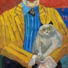 The central figure is the cat — fluffy, with large expressive green eyes, it appears to be the main character of the painting. Its gaze, directed straight at the viewer, is full of dignity and subtle irony. The man in a bright yellow jacket holds the cat in his arms.