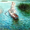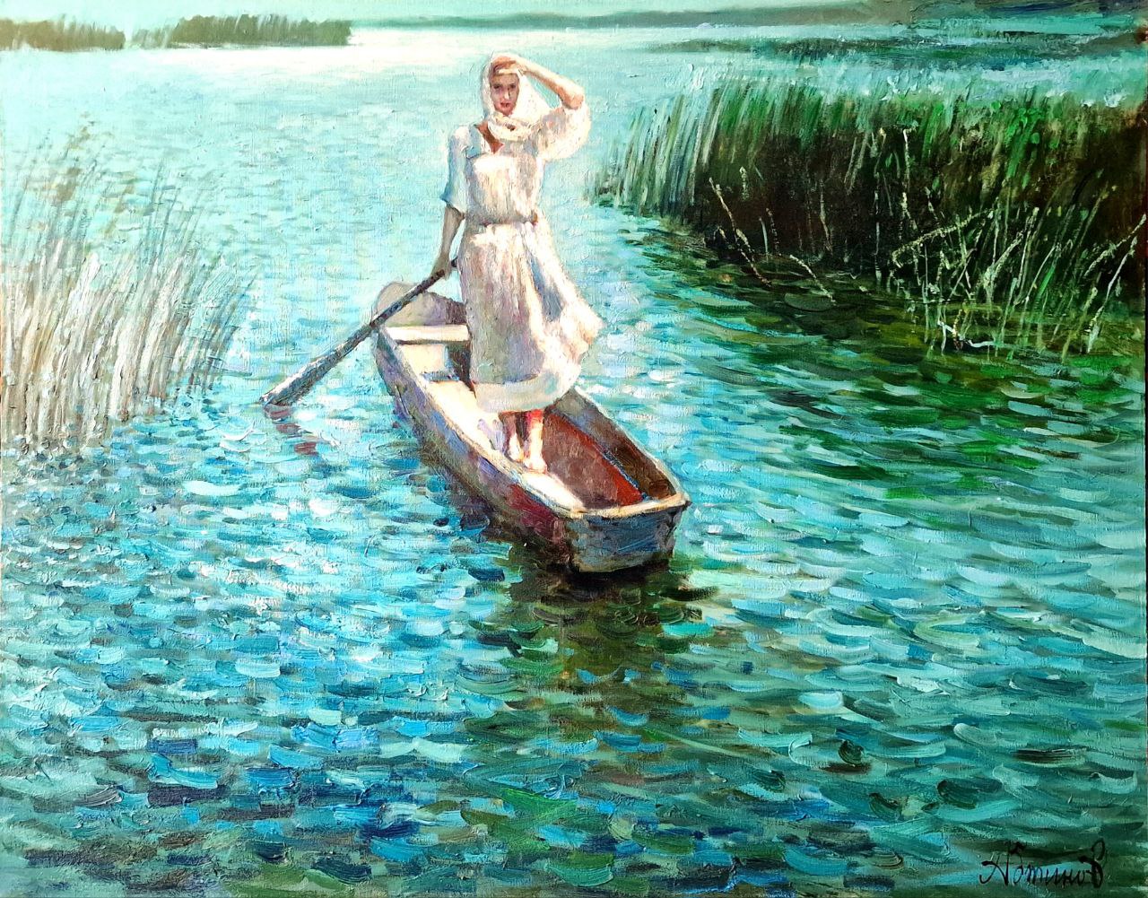 The painting "Jade Lake" immerses the viewer in a quiet, poetic atmosphere of enchanting nature. In the center of the composition is a woman in a light dress, standing in a boat gliding along the emerald waters of the lake. Her pose, with her hand raised to her eyes, conveys a sense of thoughtfulness and expectation, she looks into the distance, as if peering into the future or reflecting on something secret.