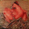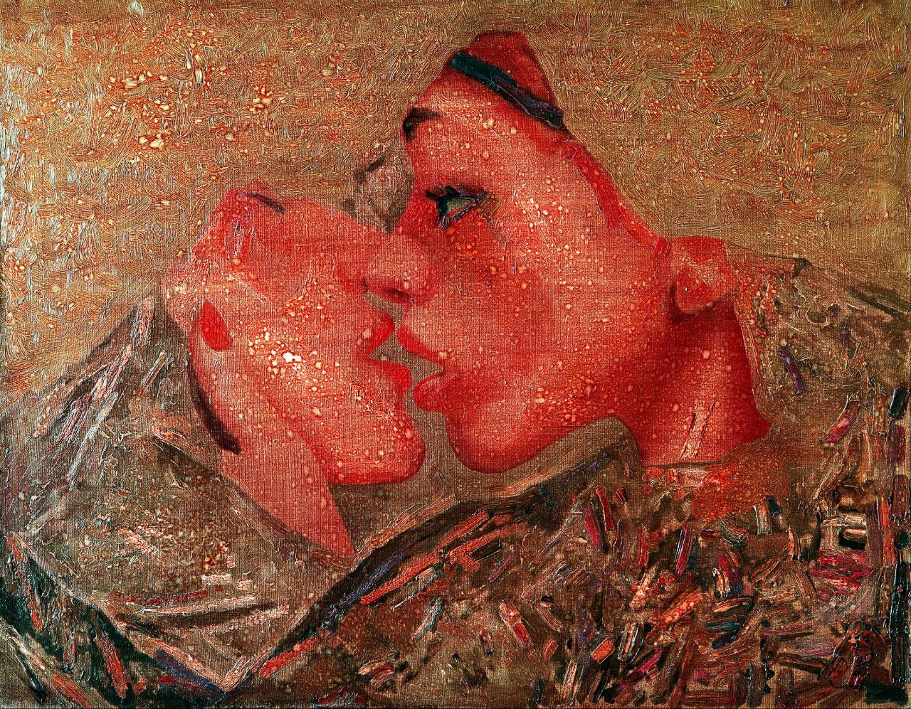 The painting “Passion” is imbued with a vivid emotional energy and sensuality. The central element is the image of two faces united in a kiss. Their red tones predominate, symbolizing the raging emotions, passion and intensity of the moment. The faces are executed in an almost abstract manner, reminiscent of a mosaic style, which emphasizes the multi-layered feeling and its elusiveness to clear forms.