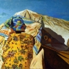 The background of the painting is majestic sand hills, flooded with light, emphasizing the scorching heat of the day. The blue sky, free of clouds, adds depth to the plot and creates a contrast with the golden and yellow-brown shades of the hills and clothes.
