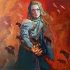Flying images circle around the heroine - birds and animal silhouettes, reminiscent of shadows or spirits. They give the painting a mystical atmosphere and create a sense of movement, as if the surrounding space is animated by her magical energy. The background is saturated with shades of red, orange and warm brown, symbolizing passion, energy and magical power. These colors contrast with the soft light emanating from the woman's figure.