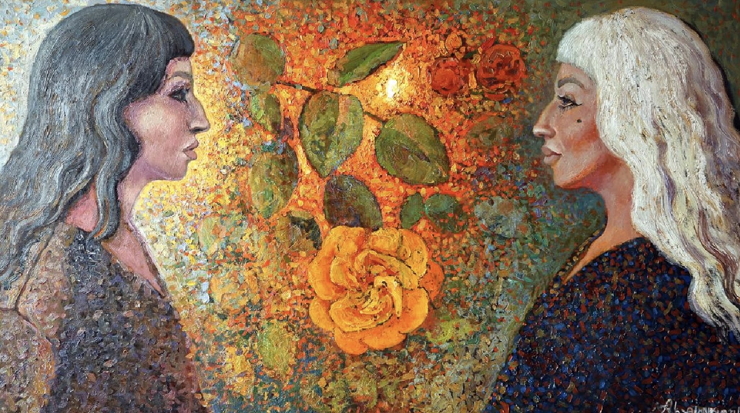 The Birth of Venus is a symbolic and emotionally charged scene. Two female figures with different hair colors, one with black and one with white, face each other. Their gazes seem to be filled with understanding or a deep dialogue without words, and their presence is surrounded by a golden-orange warmth.