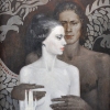 The painting “Two” depicts a complex, emotionally charged moment between two people who represent opposing, yet complementary energies. In the foreground, a pale female figure stands out, her face turned to the side, her gaze filled with distant thoughtfulness. She appears fragile and delicate, as if symbolizing light, vulnerability and purity.