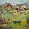 The painting "By the Water" depicts an idyllic corner of village life by a quiet backwater. In the center of the composition are two small green boats, peacefully rocking on the surface of the water, whose surface reflects the blue of the sky and the surrounding greenery. They seem to have been left for a moment, as if the owners have gone away and are about to return.
