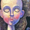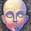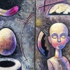 The right part of the diptych depicts a figure undergoing transformation. The head with closed eyes, as if in meditation or sleep, radiates calmness. Around it is a cracked shell resembling an eggshell or cocoon from which a new being is born. This image symbolizes emergence from an old state, rebirth. Above the head is a hemisphere resembling a planet or sky dome, with red and violet discs that possibly represent spiritual energies or cosmic influences. Intertwining lines in space create a sense of complexity and interconnectedness of events.
