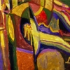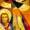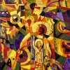 In the center of the composition, amid all this diversity, one can discern a figure resembling a human form, possibly Christ, with raised hands. This figure, painted in softer, pastel tones, contrasts with the more rigid geometric shapes, giving the painting a spiritual and philosophical nuance.