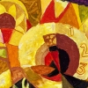 At the center of the painting, like a core, is an image resembling a sundial. Round shapes, hands, and numbers, though subtle, are present, hinting at the passage of time. Bright, sunny shades of yellow and gold dominate, creating a sense of light and energy.