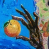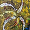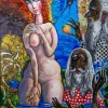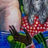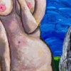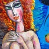 The artist uses a bold color palette and decorative elements: fish in the water, plant motifs. The work is filled with inner tension, where sensuality clashes with roughness, and mysticism with human vices.