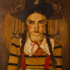 Выражение лица девушки загадочно и многогранно. Ее взгляд устремлен в сторону, в нем читается легкая грусть, игривость или даже вызов. Ярко-красные круглые пятна на щеках, напоминающие грим клоуна, подчеркивают ее «цирковую» роль, но в то же время придают образу некоторую уязвимость.
