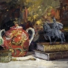 The painting "Winner" is a still life that fills the space with an atmosphere of grandeur, history and symbolism. In the center of the composition is a brightly painted red teapot, decorated with gold and green patterns, symbolizing comfort and cultural heritage. Its rich and detailed ornaments attract the eye, contrasting with the rest of the elements of the painting.