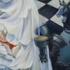 At the heart of the composition is the Queen — the most powerful figure in the game — gently cradling the king chess piece in her hands. She stands not only as a symbol of victory and salvation but also as a protector in a world of chaos, facing the remnants of a dark battle. A wild-eyed black horse emerges from the scene, engaging directly with the viewer and hinting at the forces she’s overcome.