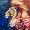The lion’s flowing mane transforms into dynamic, flame-like brushstrokes, capturing the essence of vitality, courage, and inner fire. The expressive movement of the mane gives the painting a sense of life and momentum, as if the lion radiates energy from within.