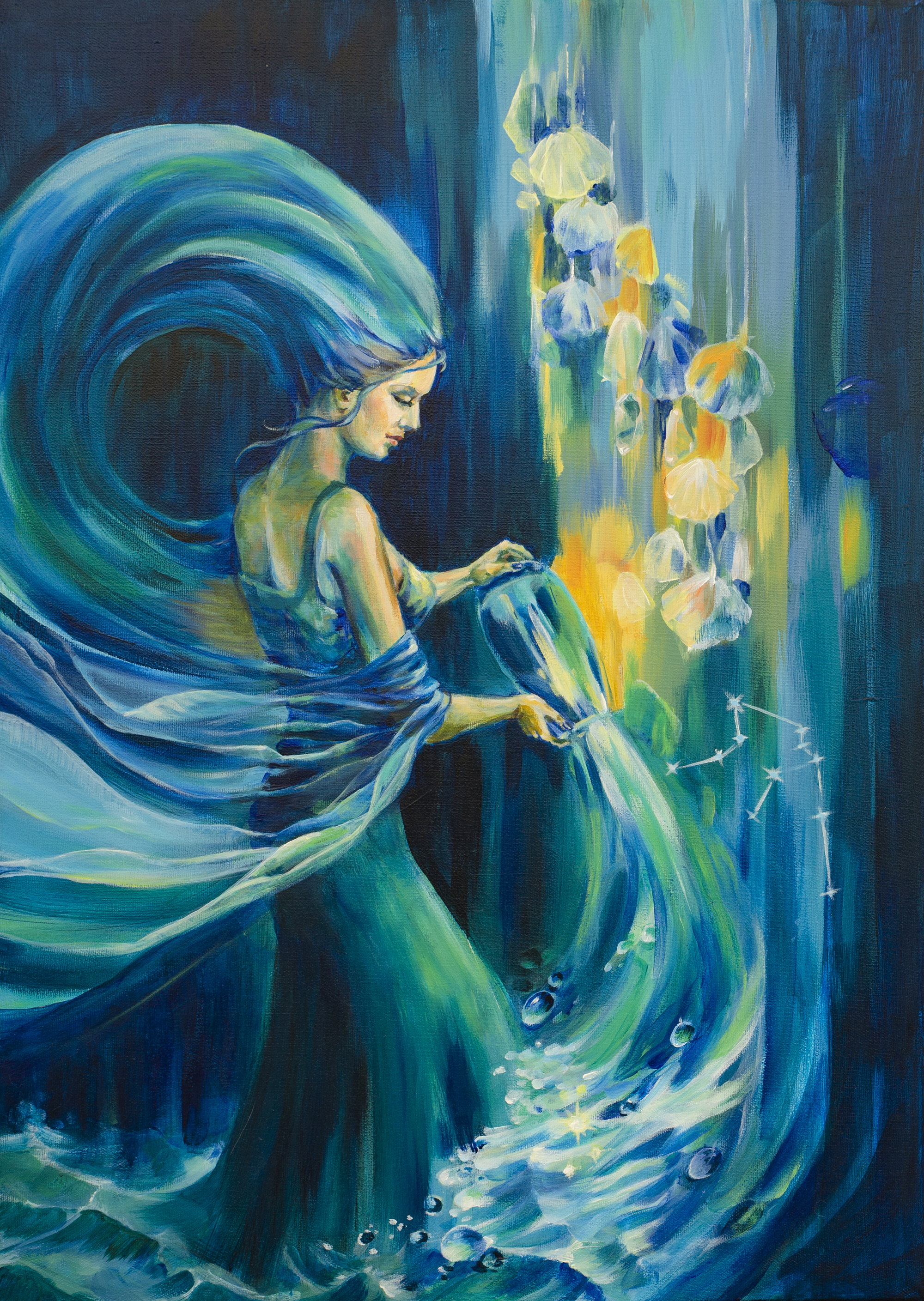 This original acrylic painting is an allegorical interpretation of Aquarius, depicted as a graceful feminine figure embodying the eternal element of water. She pours a luminous stream from her vessel, symbolizing not only physical water but also energy, knowledge, transformation, and renewal—core meanings associated with this zodiac sign.