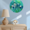 A round acrylic painting featuring daffodils in fresh green tones. Canvas on cardboard. An expressive spring floral wall panel filled with light, movement, and renewal. This round acrylic painting, measuring 40 by 40 cm, depicts a fresh and lively floral scene filled with light and motion. The composition centers on a cluster of delicate daffodils with slender stems and small, expressive flowers. The round format enhances the natural flow of the composition, allowing the flowers to rise upward in a soft, rhythmic movement, as if lifted by a gentle spring breeze.
