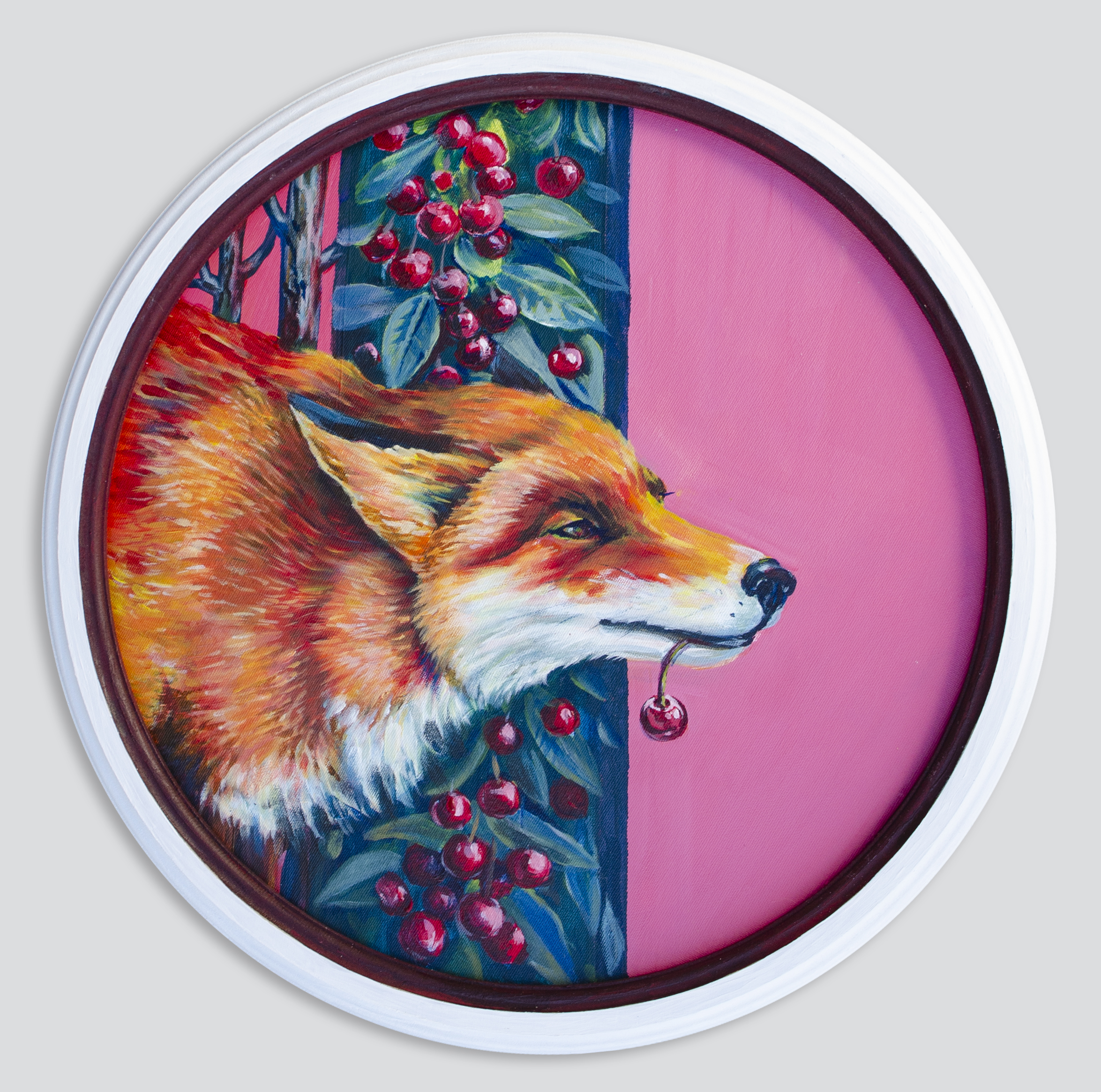 🦊 Fox Painting with Cherries – Modern Woodland Animal Art (40 × 40 cm)