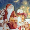 An oil painting featuring a snowman and Ded Moroz titled "Magical evening".