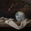 A still life featuring a Chinese vase, dried flowers, stones, and draped fabric, painted in a calm palette, conveys an atmosphere of tranquility and antiquity.