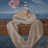 The centerpiece of the composition is a massive shell resting on a wooden railing, through which, defying logic, a branch of delicate magnolia grows. The use of levitation — with floating nearby pebbles and a second shell — gives the canvas a touch of surrealism and lightness. The background, featuring an endless sea surface and a barely discernible horizon, expands the space of the painting, turning the still life into a window to a serene world.