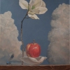 The central element — a red apple lying in a light shell on a wooden surface — looks like an altar of nature. An elongated magnolia stem crowned with a snow-white flower stretches upward, dividing the canvas into parts. The background with a cloudy sky gives the still life a sense of infinity and airiness. A blue dragonfly on the left brings a touch of life and movement, adding an element of the microcosm to this philosophical landscape.