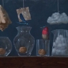 The composition is centered around a series of glass vessels placed on a wooden shelf. Inside the transparent vases are nuts, symbolizing potential or hidden essence. The true climax is the captured elements: a dragonfly perched on the neck of a vase next to a note, and most importantly, a small, realistically rendered cloud suspended in the jar on the right, along with its «free» counterpart hanging on a thread.
