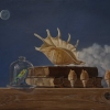 On a wooden shelf under the pale moonlight, a row of antique books is lined up, above which a large sea shell floats as if weightless. This levitation technique, characteristic of Sevarty’s style, gives the still life a dreamlike quality. Nearby, under a glass dome, a bright green tree frog is frozen in place, its contrasting color becoming the emotional focal point of the work. A series of small shells complements the «marine» theme, emphasizing the motif of memories of a distant element.