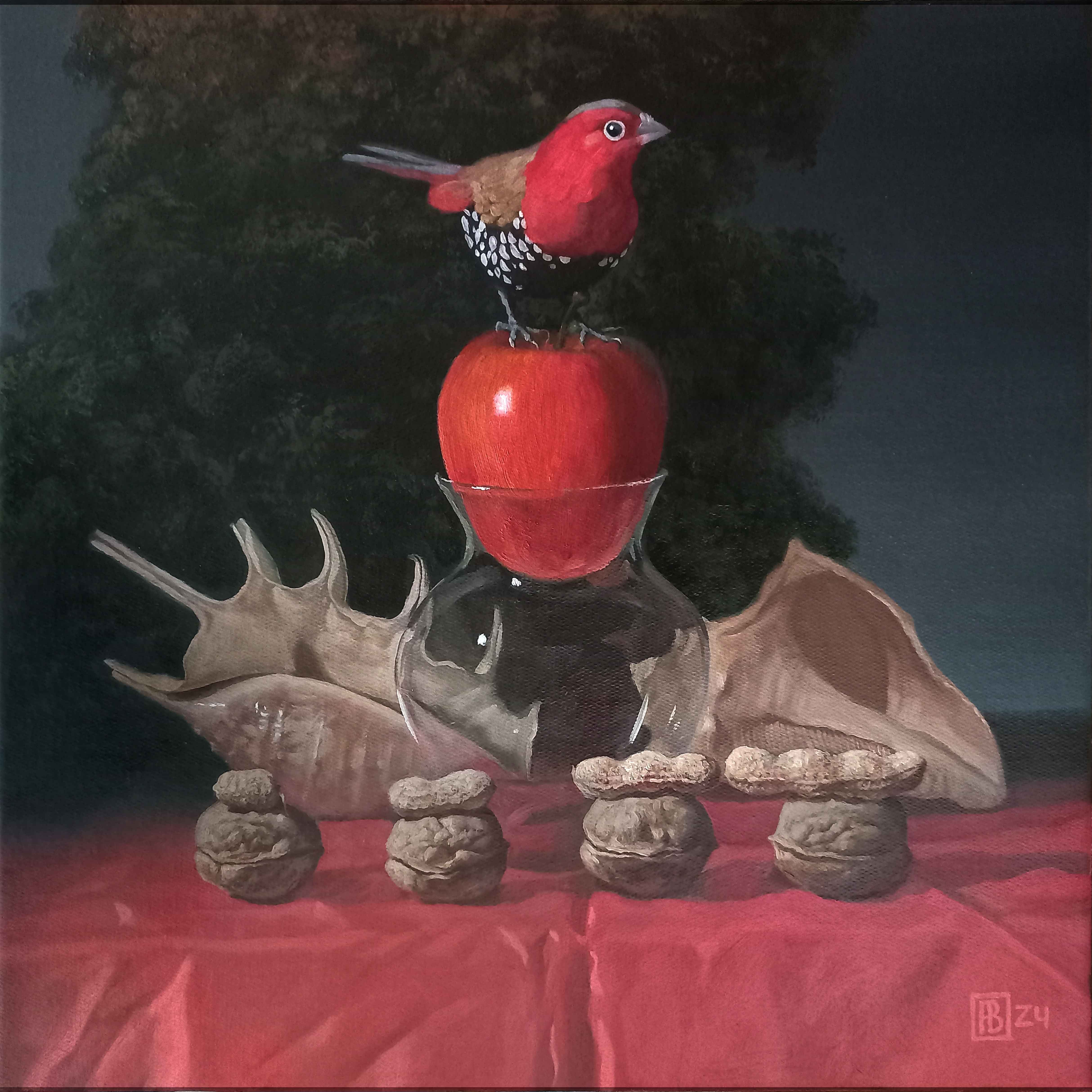 The painting «Красный» by Sevarty is a captivating visual puzzle where a classic still life blends with elements of surreal play. The artist arranges the composition around a central vertical axis, where a bright red apple crowning a transparent vessel serves as a throne for a striking bird with scarlet plumage.