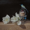 The painting «Large white flowers» is a celebration of refinement and visual hedonism. The artist Sevarty constructs the composition on contrast: delicate, almost glowing from within white flowers stand alongside a tempting cupcake under a glass dome. Crowning this intimate «feast» is a tiny hummingbird, frozen in anticipation, like a precious gem accidentally fallen onto the transparent dome.
