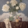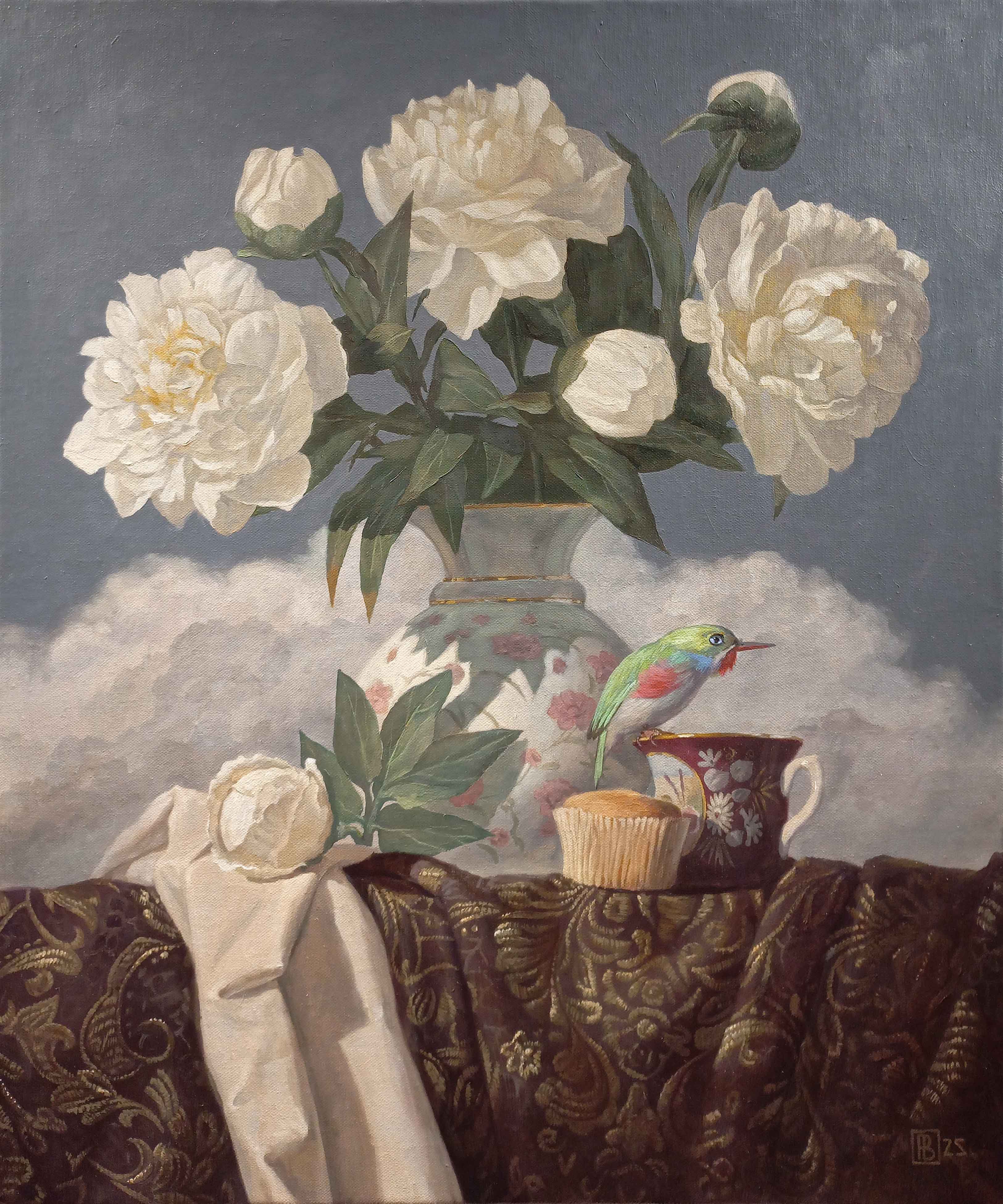 The painting by Sevarty, «Mini Muffin for Cuban Tody», is a delicate canvas where the material world meets the poetry of the unreal. At the center of the composition is an exquisite vase, immersed in lush white peonies, beneath which, as if floating in the clouds, lies a morning still life. Next to the miniature muffin sits a tiny bird — the Cuban tody, whose bright plumage adds a touch of lively energy to the calm color palette.