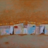 The painting depicts a row of low buildings resembling rural or country cottages. Their walls are covered with light plaster, peeling in places, giving them an aged, lived-in appearance. Some windows and doors are highlighted with bright but not flashy colors — red and blue. Above the roofs, a string of bulbs stretches, softly illuminating the space and creating a festive atmosphere. Some windows are draped with light fabric that sways in the breeze, adding dynamics and liveliness to the painting.