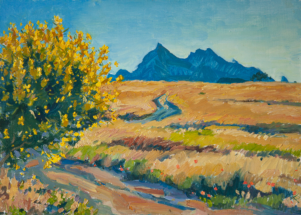 A narrow winding road begins at the bush, meandering through endless fields of golden wheat hues. Along the road, spots of wildflowers add color to the overall ochre palette. On the horizon, majestic blue mountain ranges rise, their cool tones creating a harmonious contrast with the warm palette of the fields and the bright yellow bush.