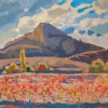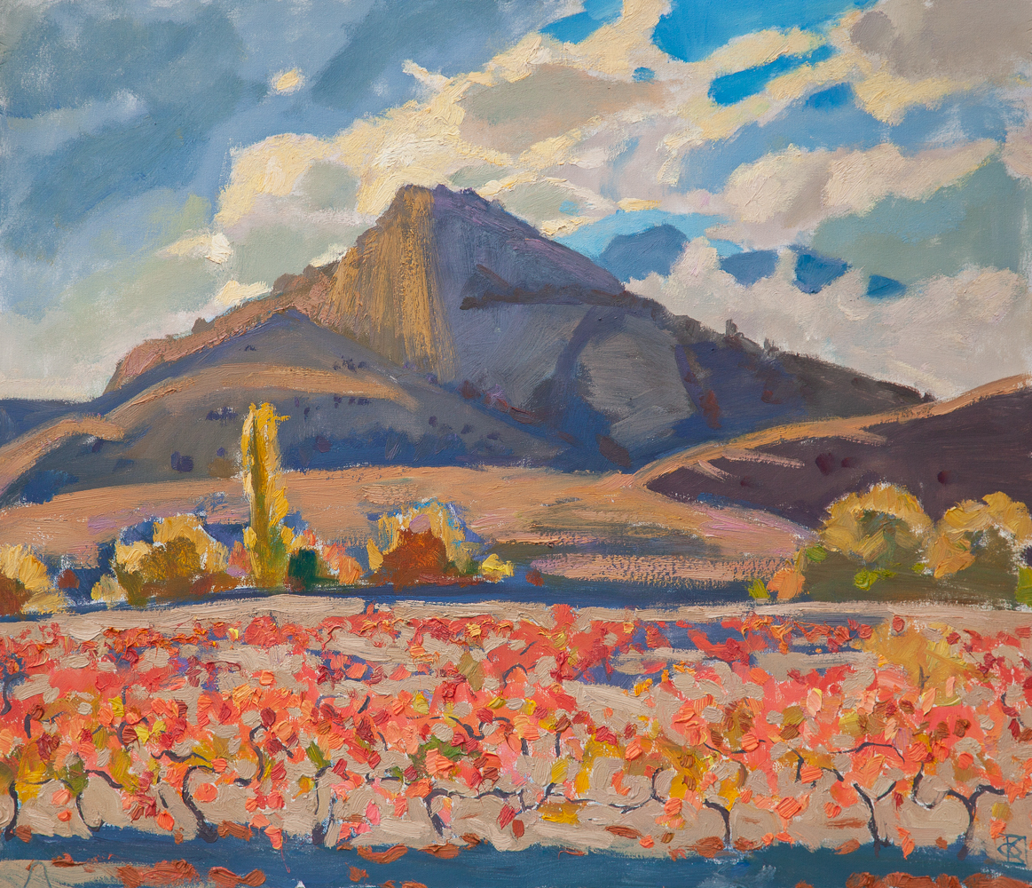 Olga Konorova's painting «Songs of Autumn» is a picturesque canvas imbued with the mood of late autumn, when the harvest has been gathered and nature is preparing for winter. In the foreground of the painting stretches a vineyard, whose vines are painted in bright autumn shades: fiery reds, golden yellows, and oranges. These colors create the effect of a blazing carpet, contrasting with the more subdued tones of the surrounding landscape.