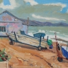 In the background, a modest low building with peeling paint adds realism and a sense of simple life to the painting. In the distance, beyond the boats, stretches a greenish sea stirred by winter winds, against which the outlines of mountains shrouded in a light haze emerge. The sky above is changeable, with clouds through which sun rays break, imparting some hope and contrast to the scene.