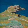 These paths lead to a rocky outcrop that seems to rise from the sea, emphasizing the beauty and power of nature. On the seaside outcrop moves a figure dressed in black, his silhouette sharply outlined against the bright blue, almost turquoise sea. Next to him is a white dog, joyfully running along the path as if playing with the wind and sun.
