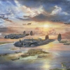 In the Southern Hemisphere, at altitude above the Solomon Islands, illuminated by the setting sun breaking through the clouds, American Lockheed PV-1 Ventura aircraft fly in the foreground. The time depicted in the painting is July 1944.