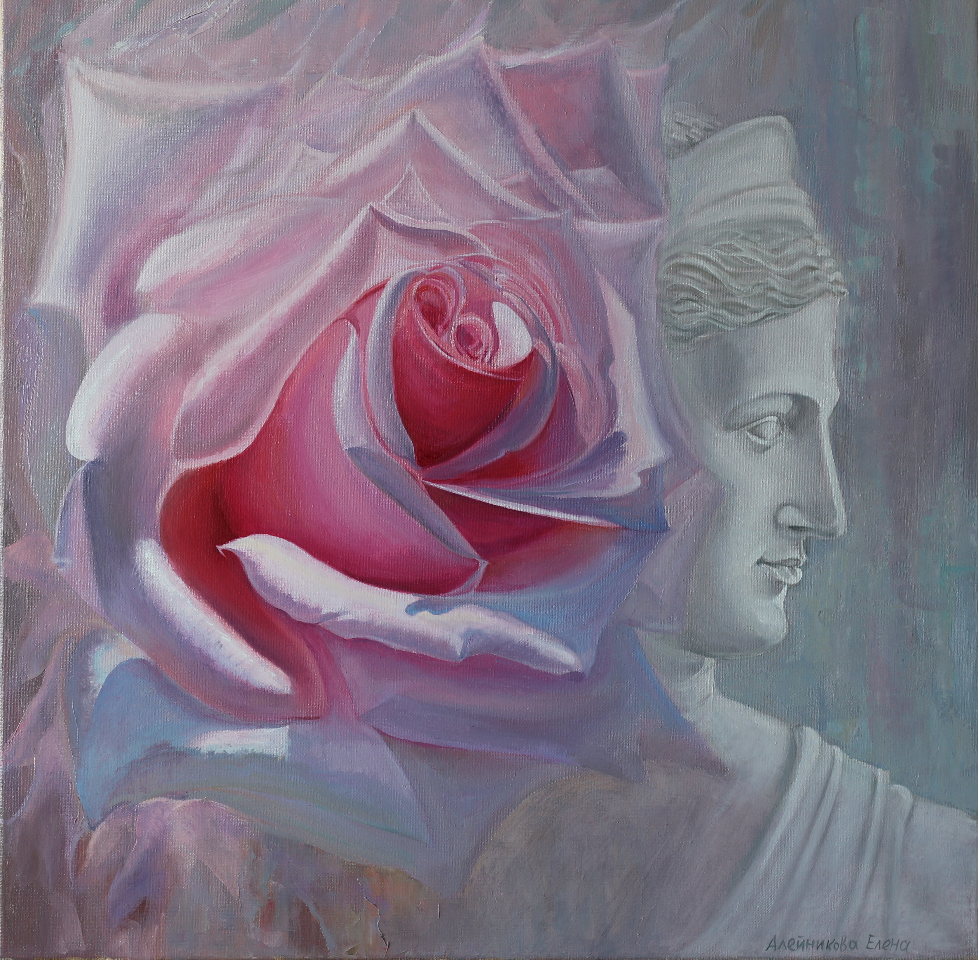 On the right, the artist added the profile of an antique sculpture, executed in cool shades. This part of the painting personifies the ideal of classical beauty with its clarity of lines, calm and majesty. The fusion of a living rose and a motionless statue creates a strong contrast between the fragility of nature and the eternity of art.