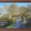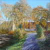 The foliage of the trees is painted in typical autumn shades - golden, brown and red colors harmoniously combine with the bluish sky. Light rays of sunlight shimmer in the crowns of the trees, softly illuminating the buildings and the path. Picturesque bushes and grass along the path add a sense of coziness and well-groomedness.