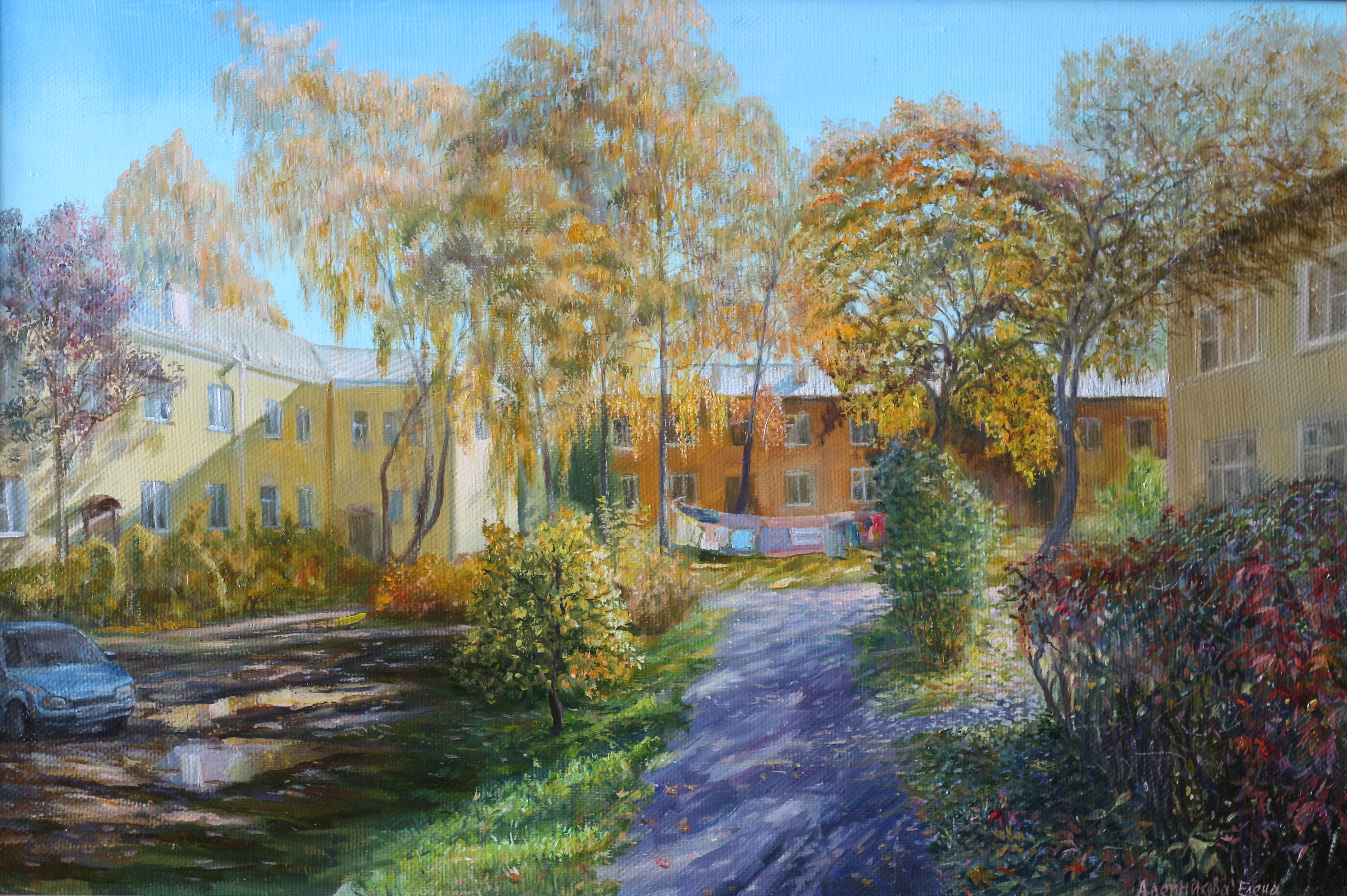 The painting depicts a cozy courtyard on an autumn day, filled with peace and warmth. Yellow two-story houses with small windows seem to frame the space, creating an intimate, cozy atmosphere. Between them stretches a narrow path leading to the center of the composition, where laundry is hung on a line, adding a domestic note to the overall scene.