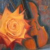 The painting is filled with sensual symbolism, combining music, art and the beauty of nature. The central place here is occupied by a delicate yellow-orange rose, which has blossomed its bright petals. Its rich warm color seems to embody passion, inspiration and creative energy.