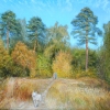 October's still sunny weather. Two people with a dog are walking along a path through a meadow among autumn grasses. A beautiful meadow overgrown with grasses and the path leading toward the viewer draws attention to the bright dog in the foreground. Around, wild dry grasses sway in the wind. The meadow is surrounded by pines and other trees already half-yellowed. The bright sky, with clouds receding from the viewer, creates a sense of depth. The people and the dog, moving toward the viewer, emphasize the complex movement in the painting.