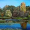 An autumn sunny day on the river. Above the multicolored foliage of shrubs and small trees stands a large birch tree, dressed in a golden autumn outfit. The painting is called "Golden Dominant." The birch contrasts with the sky and water, towering above everything around.