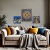 The background of the painting is rendered in deep blue tones, symbolizing the night sky. Scattered across it are small white dots representing stars, which give the painting a sense of infinity and mystery. The sky appears boundless, and its depth contrasts with the warm colors of the houses, creating a harmonious combination.