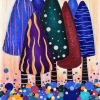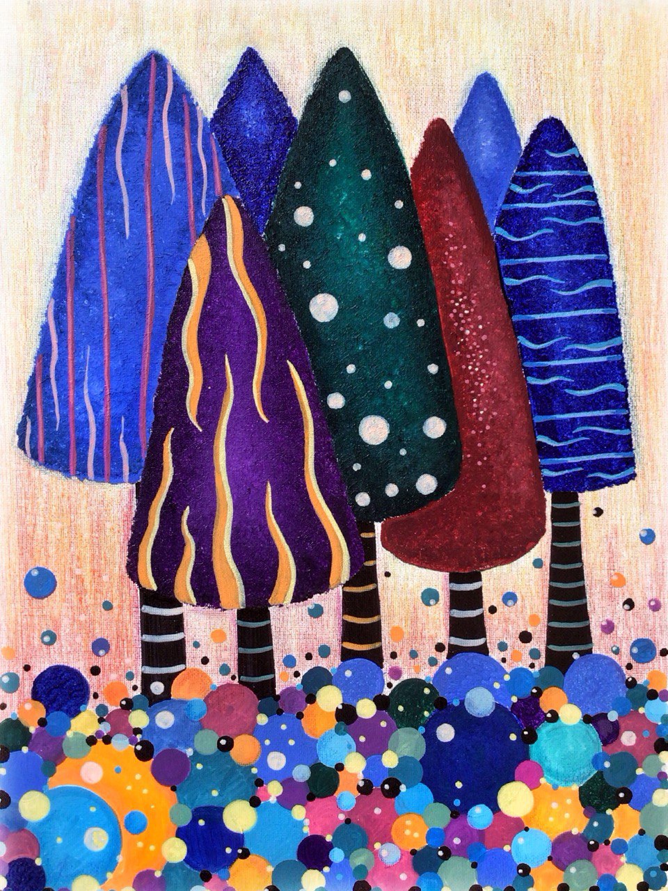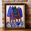 This painting is a bright and colorful work of art that captures attention with its unusual composition and rich colors. In the foreground, stylized trees are depicted in various shades of blue, purple, and red. Their shapes resemble abstract figures, giving the painting dynamism and a contemporary feel.