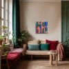 · Description: The painting is meditative and static. Emerald depths flow into the calmness of beige, while splashes of fuchsia and blue only hint at future movement. The stripes here are like strings not yet tuned, and the circles and ovals are primary cells, nuclei from which growth is about to begin. This is a state of rest before the beginning, the matrix of being.