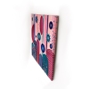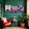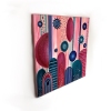 The painting breathes in shades of pink — from delicate pink to deep, almost burgundy, alongside blue and green tones. The vertical stripes in the background create a rhythmic structure, reminiscent of a musical staff or thin curtains.