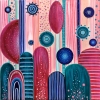 From the bottom, as if from the depths, cut ovals of varying lengths slowly and smoothly rise — they resemble tall hills or tongues of earth covered with patterns of dots and stripes. This is not a jerk, but a viscous, almost weightless ascent. In the upper part of the painting, a single whole oval, several circles, and a semicircle hover, the latter peeking out from behind a vertical stripe, as if holding its breath before fully appearing.
