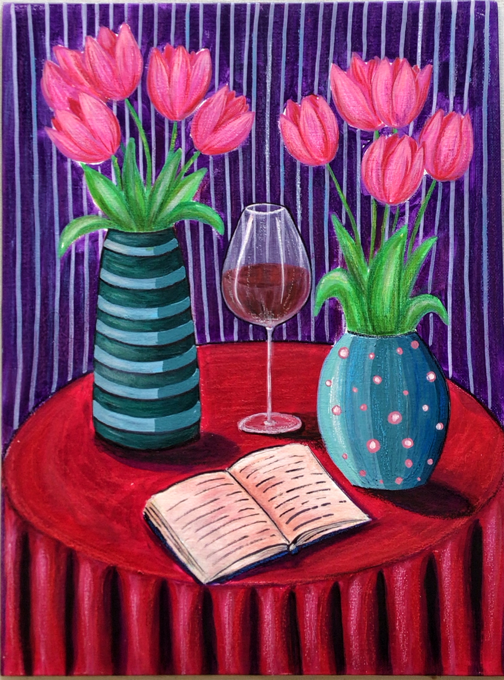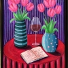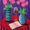 Ultimately, "Friday Evening" is a hymn to the harmony of contrasts: the tall and plump vases, the strict stripe and playful polka dot, the passionate color of the tablecloth and the tenderness of the tulips, wine and poetry. Together, they create the perfect image for a leisurely evening filled with beauty.