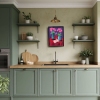 The painting "Friday Evening" exudes an atmosphere of cozy symmetry. The centerpiece of the composition is a table covered with a tablecloth of rich red-pink color—a juicy, berry shade that immediately draws the eye and sets a warm, relaxed mood.